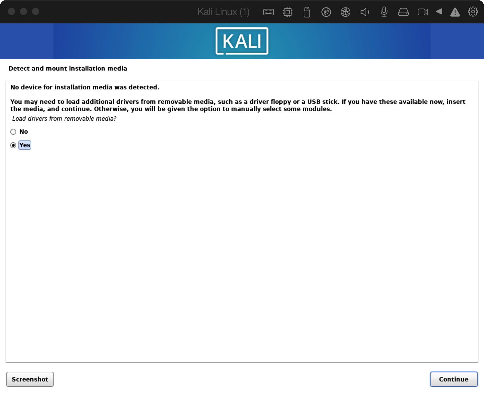 | Description | Machine: MacbookPro 14inch When I install Kali Linux in Parallel Desktop, It always report "No device was detected". normal: issue: | ||||