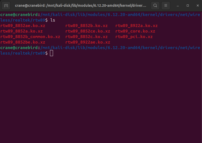 Here is the output of the 'ls' command on the comparative directory in Ubuntu: /lib/modules/6.11.0-24-generic/kernel/drivers/net/wireless/realtek/rtw89/ ls-dir-output.txt (256 bytes)