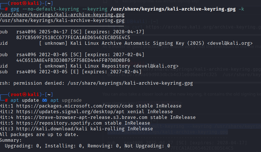 | Description | � Bug Report: apt still uses outdated key despite keyring update Despite following the official Kali keyring migration instructions, the APT system continues to reference the old key or fails with signature errors. I am unable to receive package updates for over 14 days, even after correctly installing the new key and using the signed-by directive. | ||||