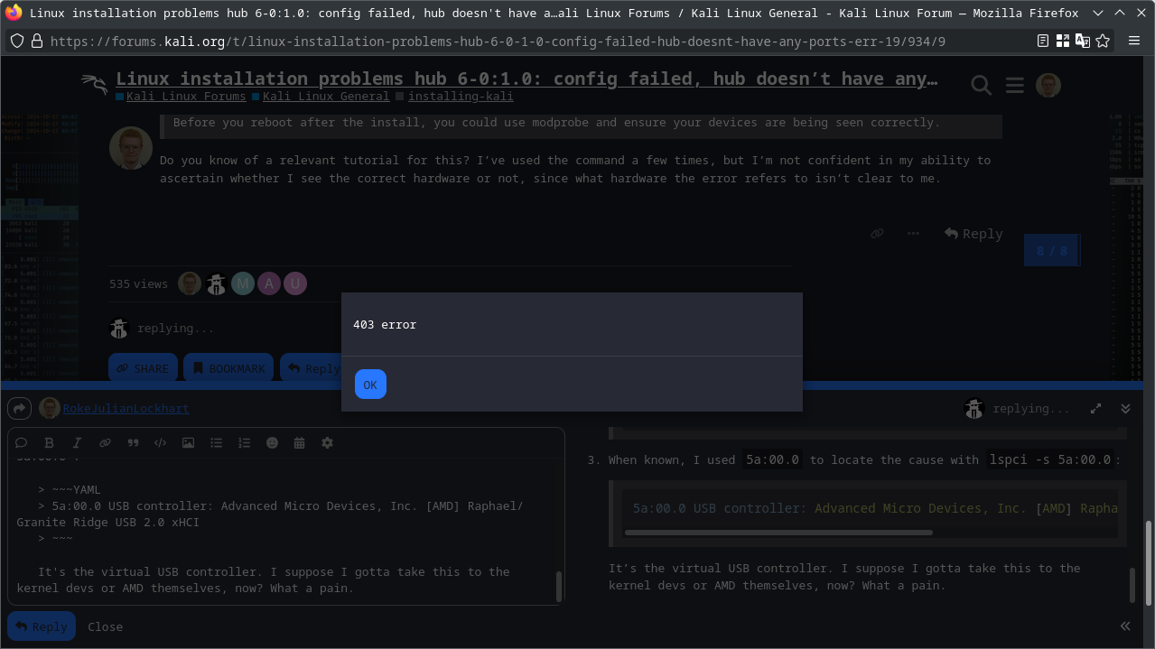 [quote="RokeJulianLockhart, post:9, topic:934"] what hardware the error refers to isn’t clear to me [/quote] Using the undermentioned: > ~~~YAML > hub 12-0:1.0: config failed, hub doesn't have any ports! (err -19) > ~~~ I've ascertained what the cause is: 1. Using `lsusb -t`, I find: > ~~~YAML > /: Bus 012.Port 001: Dev 001, Class=root_hub, Driver=xhci_hcd/0p, 5000M > ~~~ `Driver=xhci_hcd/0p` means it has 0 ports, which is invalid, hence the error. 1. I tried to `readlink /sys/class/usb_host/usb12` it to ascertain what the cause is, but that fails, because the device unsuccessfully enumerated. Consequently, I used `readlink /sys/bus/usb/devices/usb12` to verify the device ID: > ~~~log > ../../../devices/pci0000:00/0000:00:08.3/0000:5a:00.0/usb12 > ~~~ 1. When known, I used `5a:00.0` to locate the cause with `lspci -s 5a:00.0`: > ~~~YAML > 5a:00.0 USB controller: Advanced Micro Devices, Inc. [AMD] Raphael/Granite Ridge USB 2.0 xHCI > ~~~ It's the virtual USB controller. I suppose I gotta take this to the kernel devs or AMD themselves, now? What a pain. |