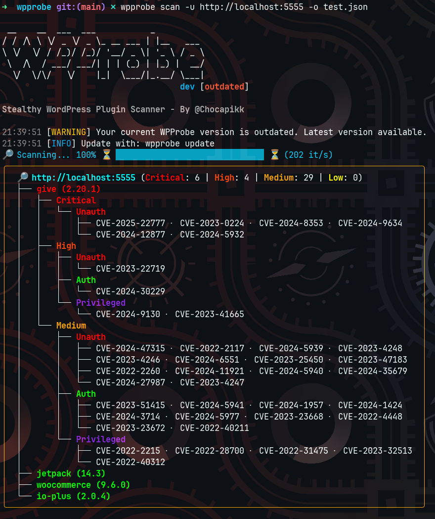 After detecting plugins, WPProbe correlates them with known public vulnerabilities (CVE) and outputs results in CSV or JSON format. Usage examples: