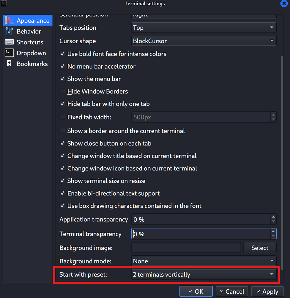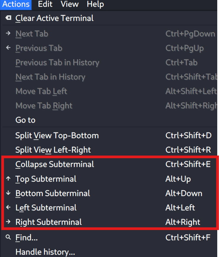 | Description | In the Kali Linux Terminal Emulator, when the “Start with preset: 2 terminals vertically” option is enabled under Preferences > Appearance, the subterminal shortcut keys (e.g., Collapse Subterminal, Top/Bottom/Left/Right Subterminal) do not work upon first launch. However, once a user manually clicks on any “Action” button once (via mouse), all shortcut keys begin to function as expected. | ||||