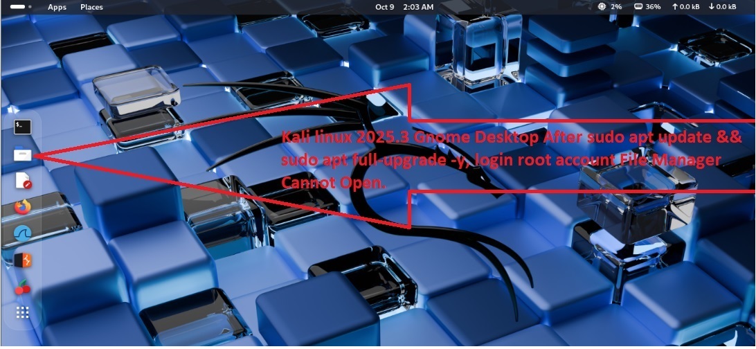 | Summary | 0009344: kali 2025.3 gnome desktop after upgrade in root file manager not open. | ||||