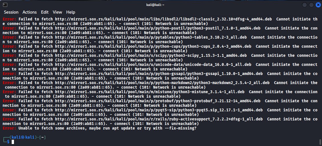 | Description | When attempting to update or install packages via APT in Kali Linux, I encountered multiple errors related to network connectivity. The error messages indicate that the system cannot connect to the mirror server at mirror1.sox.rs (IP: 2a09:a881:65), which results in failed downloads for multiple packages. This issue prevents proper package installation or system updates. Error: Failed to fetch http://mirror1.sox.rs/kali/kali/pool/main/libs/libstd2/libstd2-classic_2.32.10+dfsg-4_amd64.deb Cannot initiate the connection to mirror1.sox.rs (2a09:a881:65). -- connect (101: Network is unreachable) Distribution: Kali Linux Version: Kali Linux 2025.10-18 Architecture: amd64 Kernel: 6.12.0-kali1-amd64 Country : Egypt Open a terminal in Kali Linux. Run the command: the output showing multiple failed attempts to fetch packages from the mirror. Additional Information: The network connection is working fine for other services (i.e., browsing, etc.), suggesting the issue is specific to the package mirror. The mirror mirror1.sox.rs appears to be unreachable, and no packages could be fetched from it. Error Logs: See the attached screenshot for detailed error output from the terminal. | ||||