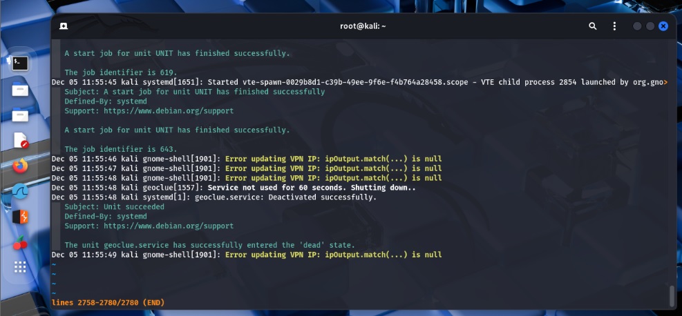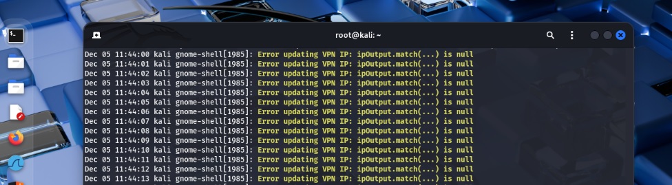 | Summary | 0009421: kali gnome-shell[1901]: Error updating VPN IP: ipOutput.match(...) is null | ||||