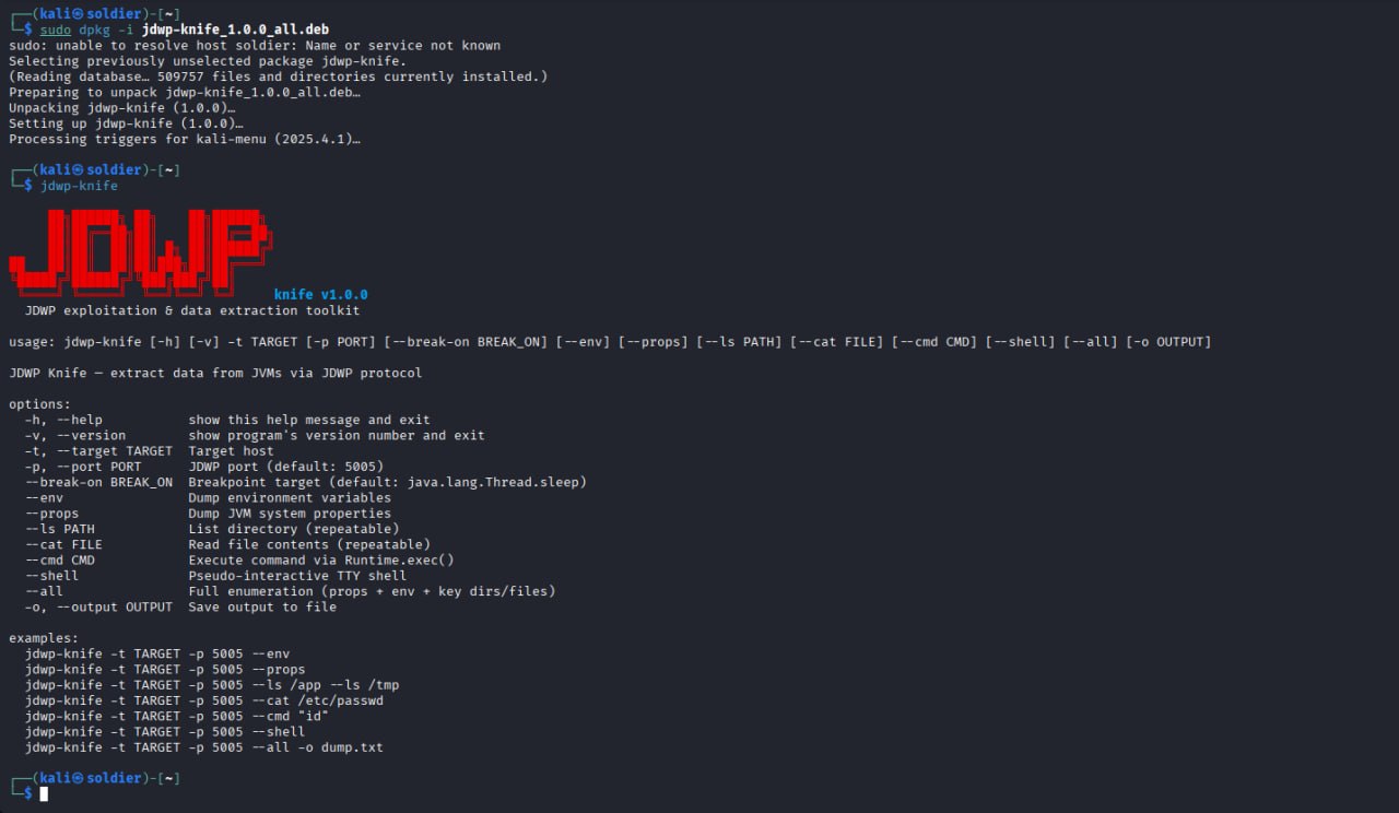 [Name] - jdwp-knife [Description] - A modern Python 3 tool for JDWP (Java Debug Wire Protocol) exploitation. Key features: pseudo-interactive shell, environment/property dumping, and file system navigation via JDWP method invocation. It is designed to be a more stable and feature-rich successor to jdwp-shellifier. [Dependencies] - python3 (stdlib only) [Activity] - Active development, first stable release with debian/ metadata. [Packaged] - Yes. The repository contains a complete debian/ directory (v3.0 native format). Verified locally with debuild and lintian, provides a help message when run without arguments. |