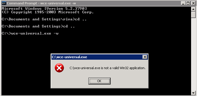 | Description | After uploading the file suscesfully on a lab box (win server 2003) and trying to run with an account with administrative permissions, I will get the "win*.exe is not a valid Win32 application" popup. I have tested downloading the file directly from the devs webpage and uploading using the same method (meterpreter upload) and it worked without problem. | ||||